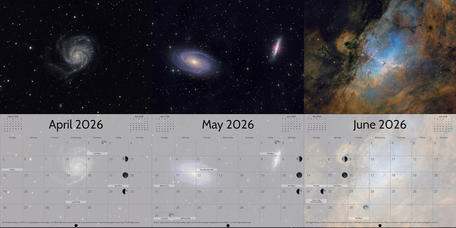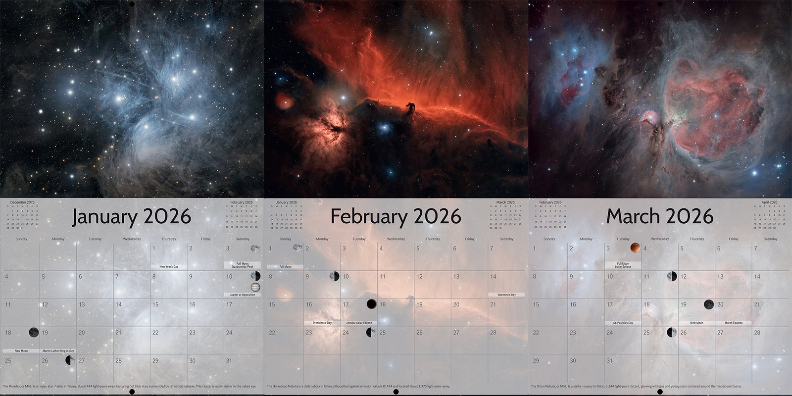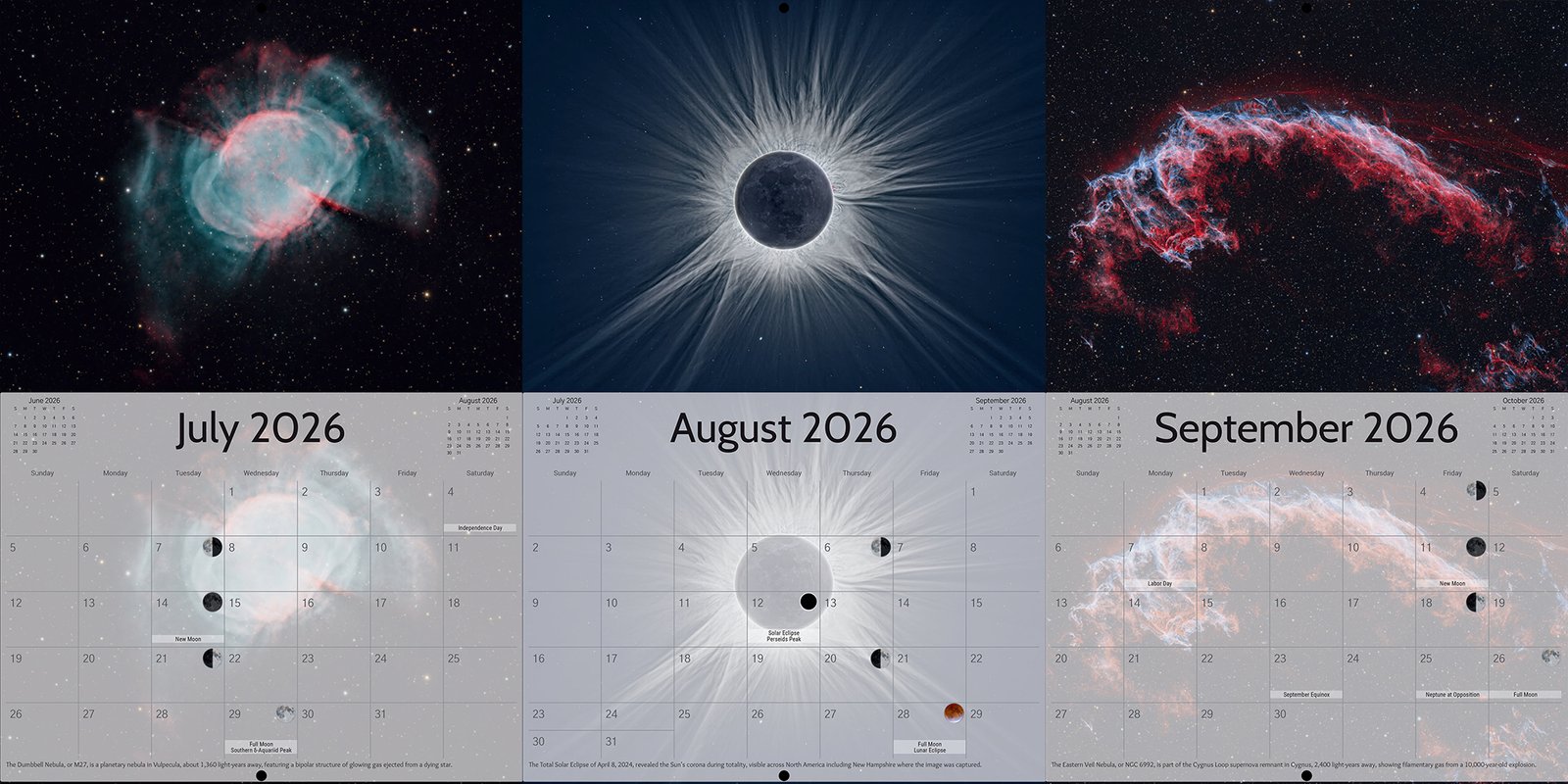 I’m happy to release my first wall calendar that brings 12 of my favorite space images taken straight from my Williamsburg backyard and New Hampshire to your wall. Each month is a full-size, tear-out glossy print (perfect for framing when the month is over), with the same image lightly layered behind the grid and some 2026 astronomy events already marked.