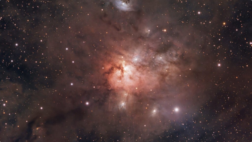 What makes NGC 1579 so special is that it is both a reflection nebula and an emission nebula at the same time. First, the bright blue areas are created when starlight bounces off thick clouds of cosmic dust. At the same time, a very young and massive star hidden inside — called LkHα 101 — lights up the surrounding hydrogen gas, giving the nebula its glowing red colors. Because the dust is so thick, it also creates the dark, twisting lanes that slice through the nebula and give it the “Trifid” (three-part) name.