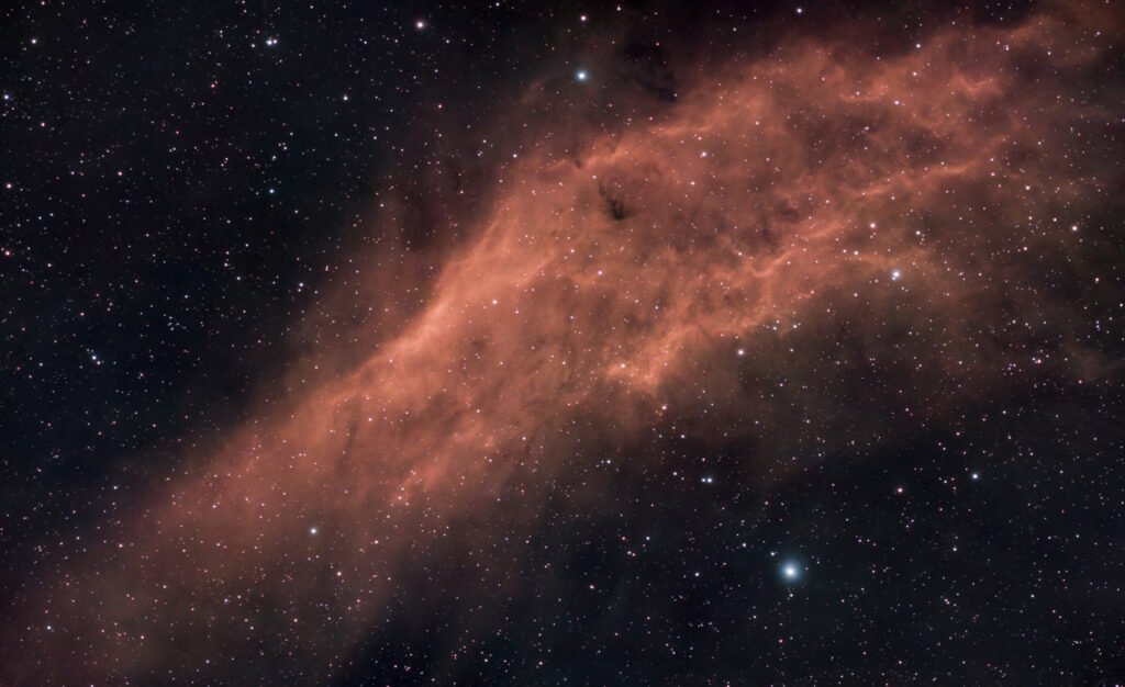 What a rewarding target! NGC 1499, better known as the California Nebula, is a stunning emission nebula in the constellation Perseus that stretches an impressive 2.5° across the sky—about five times the width of the full Moon. Located roughly 1,000 light-years away, this glowing cloud of hydrogen gas (spanning around 100 light-years) owes its eerie shape to ionized hydrogen excited by the brilliant O7 supergiant star Xi Persei (Menkib), a scorching beast with a surface temperature of over 34,000°C. Discovered in 1885 by pioneering astrophotographer E.E. Barnard from light-polluted Nashville, it’s a favorite among imagers for its sprawling, California-like outline, though it’s notoriously faint visually and shines brightest in hydrogen-alpha wavelengths.