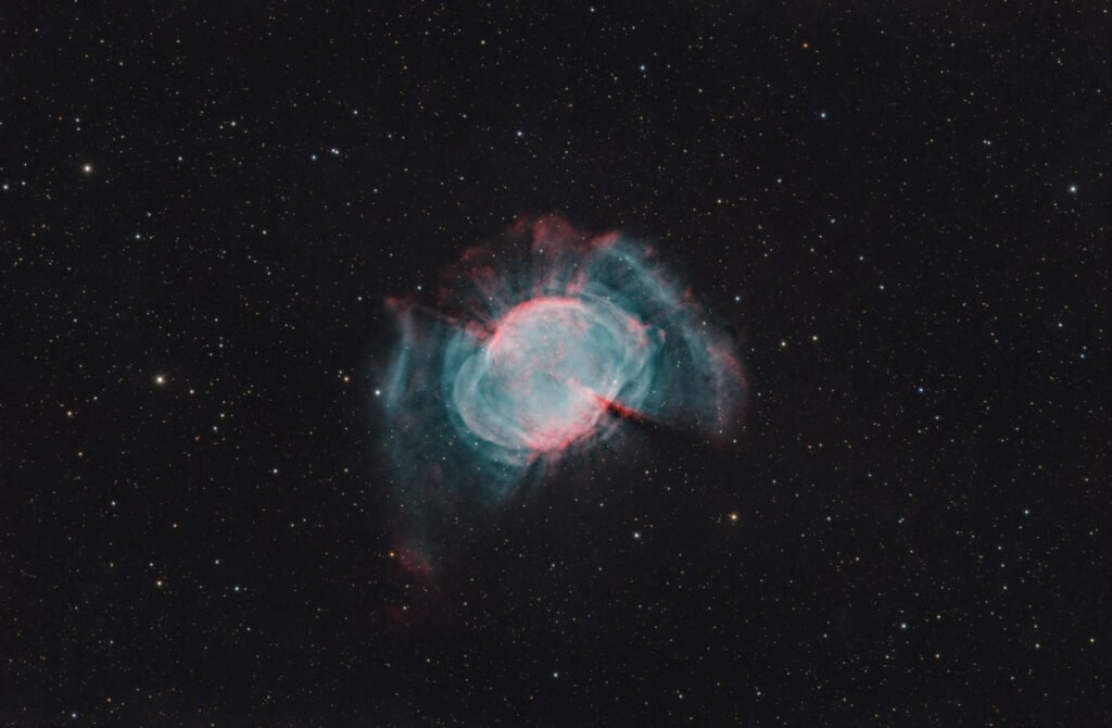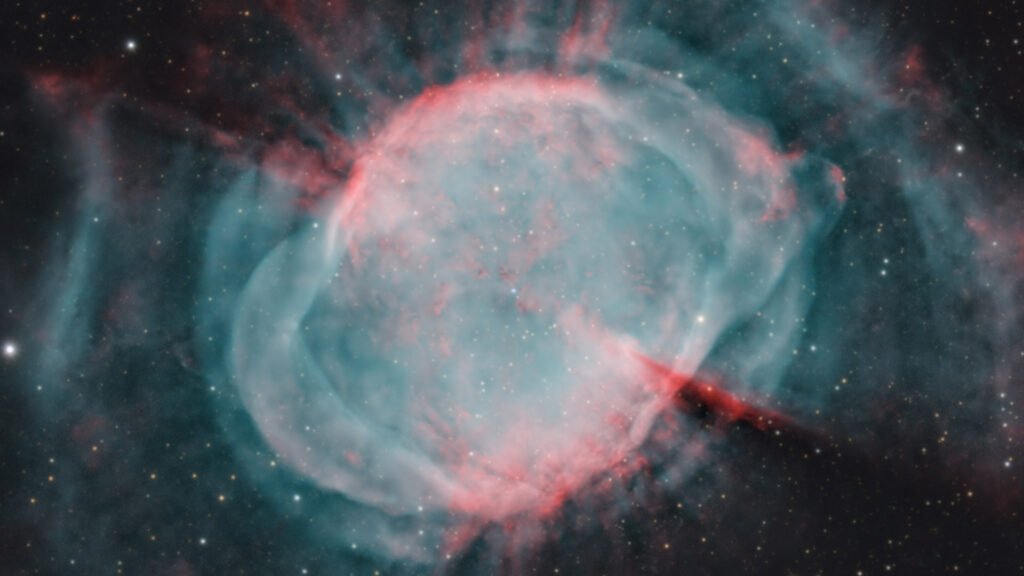 One of the brightest and closest planetary nebulae to Earth (about 1,360 light-years away), M27 was the very first planetary nebula ever discovered (by Charles Messier in 1764). It formed when a Sun-like star ran out of fuel, puffed off its outer layers, and left behind a hot white-dwarf core that now lights up the expanding gas shell like a cosmic lantern. The classic “dumbbell” or apple-core shape is created by two lobes of glowing oxygen (turquoise) and hydrogen (red) seen almost pole-on.