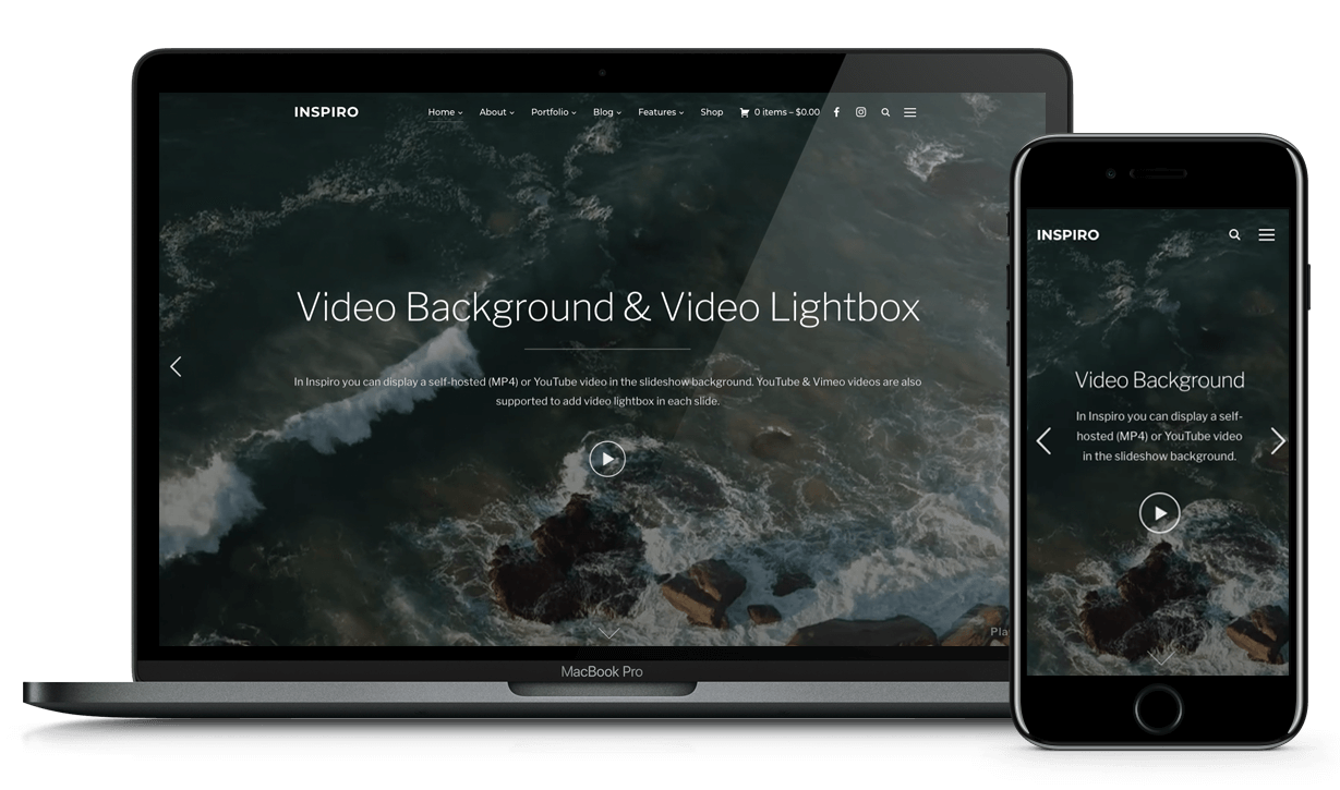 Inspiro boasts a fluid, responsive layout, so your website will display perfectly across mobile devices. Images and galleries scale up and down seamlessly when resizing the browser window. No matter what the resolution or screen size, every detail will look perfect and professional.